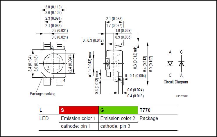 3528/1210(3.5mm*2.8mm),红绿双色,0.05W,628nm,572nm,4.5mcd-18mcd